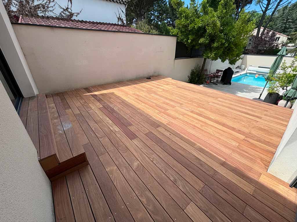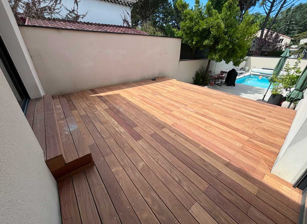 Le Cumaru, bois exotique dense et raffiné, apporte une touche chaleureuse et contemporaine à vos abords de piscine.