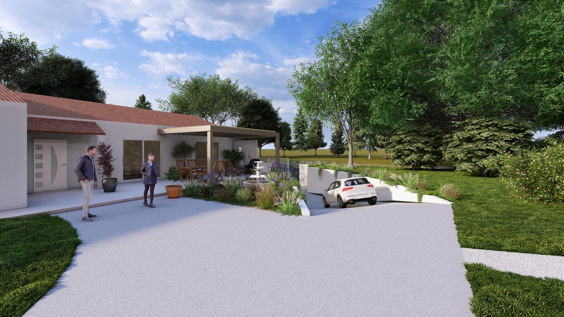 Pour cette maison, nous avons imaginé un aménagement extérieur harmonieux, où chaque espace se répond avec élégance et fluidité. Dès l’arrivée, l’avant de la maison se distingue par la mise en place d’un béton désactivé, apportant une finition naturelle et contemporaine.