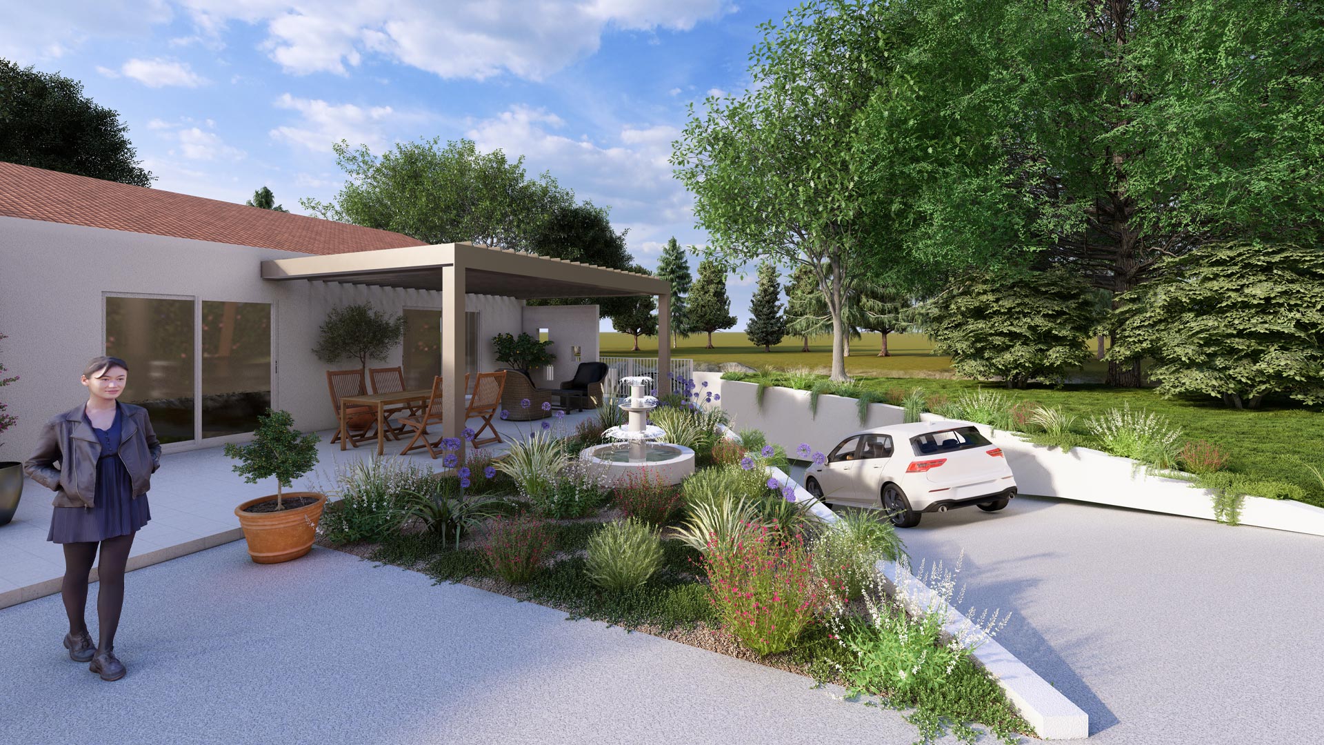 Des massifs végétalisés soigneusement composés viennent adoucir les lignes minérales, tandis qu’une fontaine centrale crée une atmosphère apaisante et accueillante.