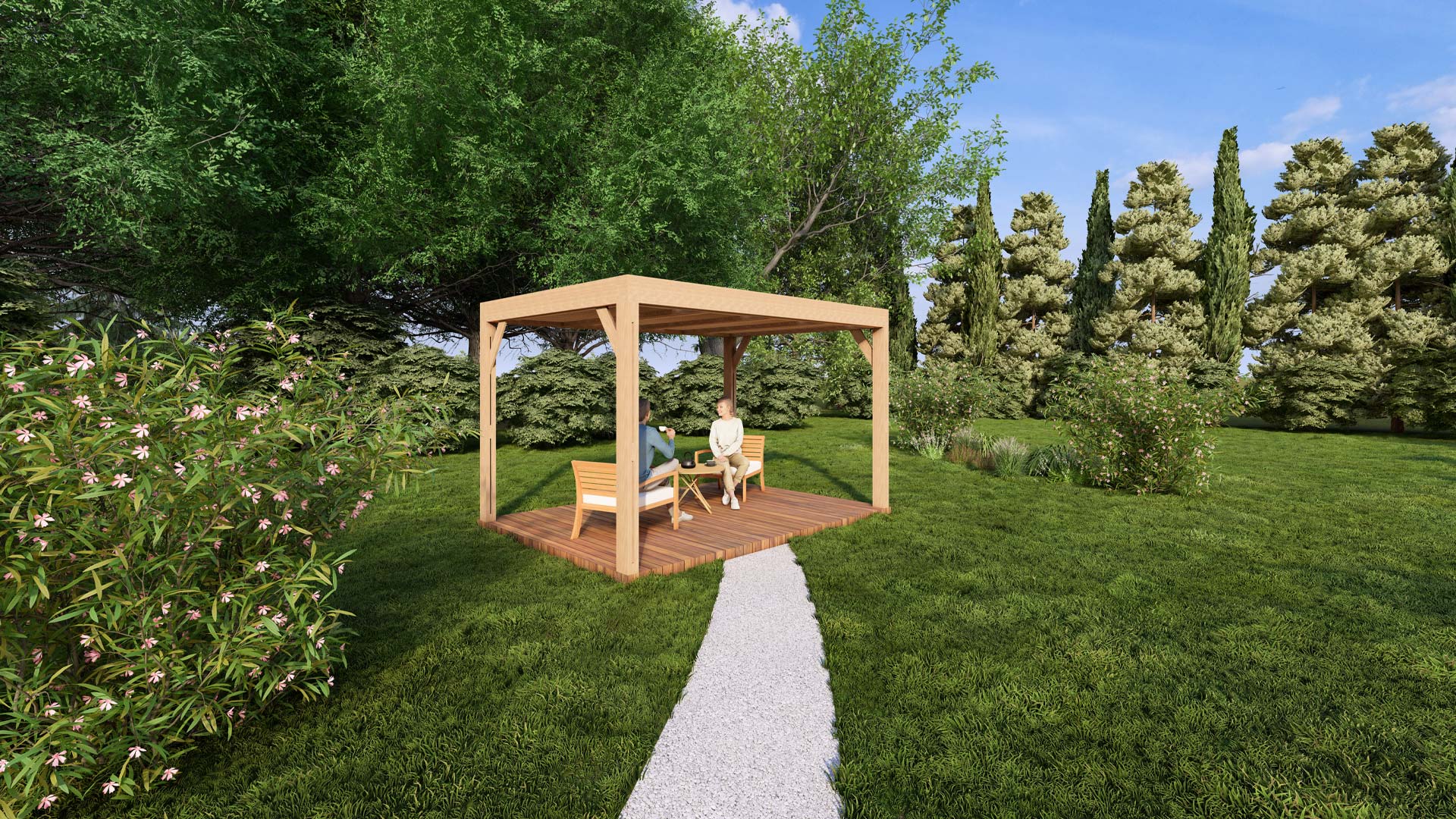 Deux cheminements en gravier blanc guident les pas ainsi que les regards vers l’arrière de la maison, un menant vers une pergola créant une transition douce et agréable.