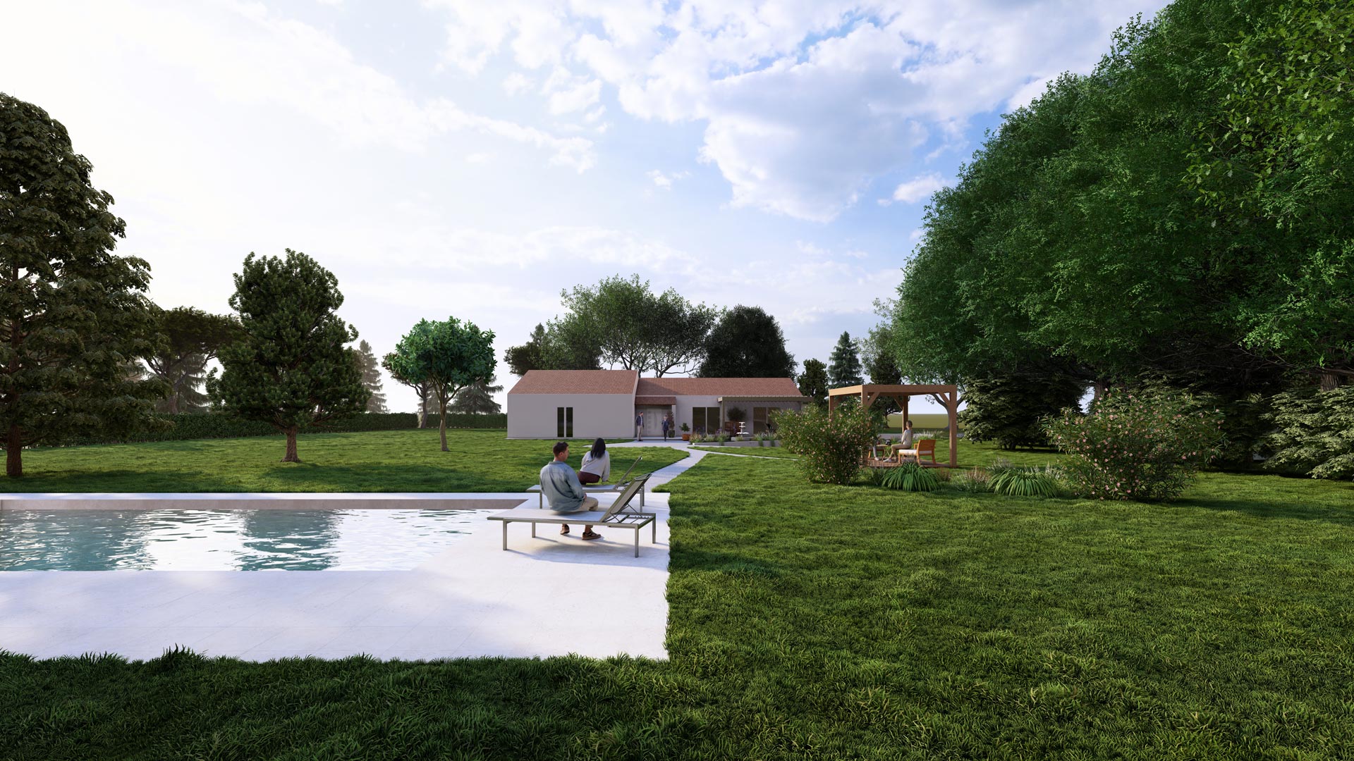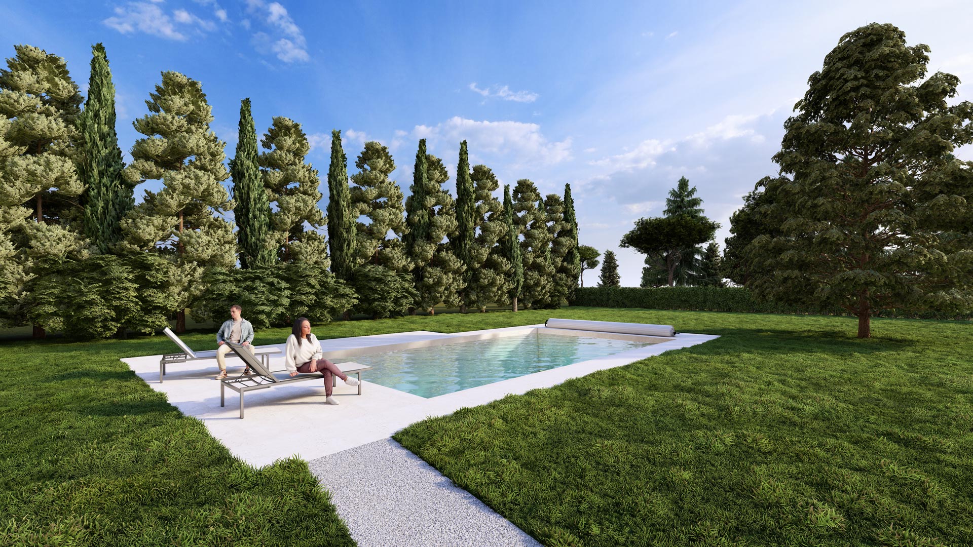 Et le deuxième menant naturellement à l’espace piscine. Autour de celle-ci, le béton imprimé structure l’espace tout en offrant esthétisme, confort et durabilité.