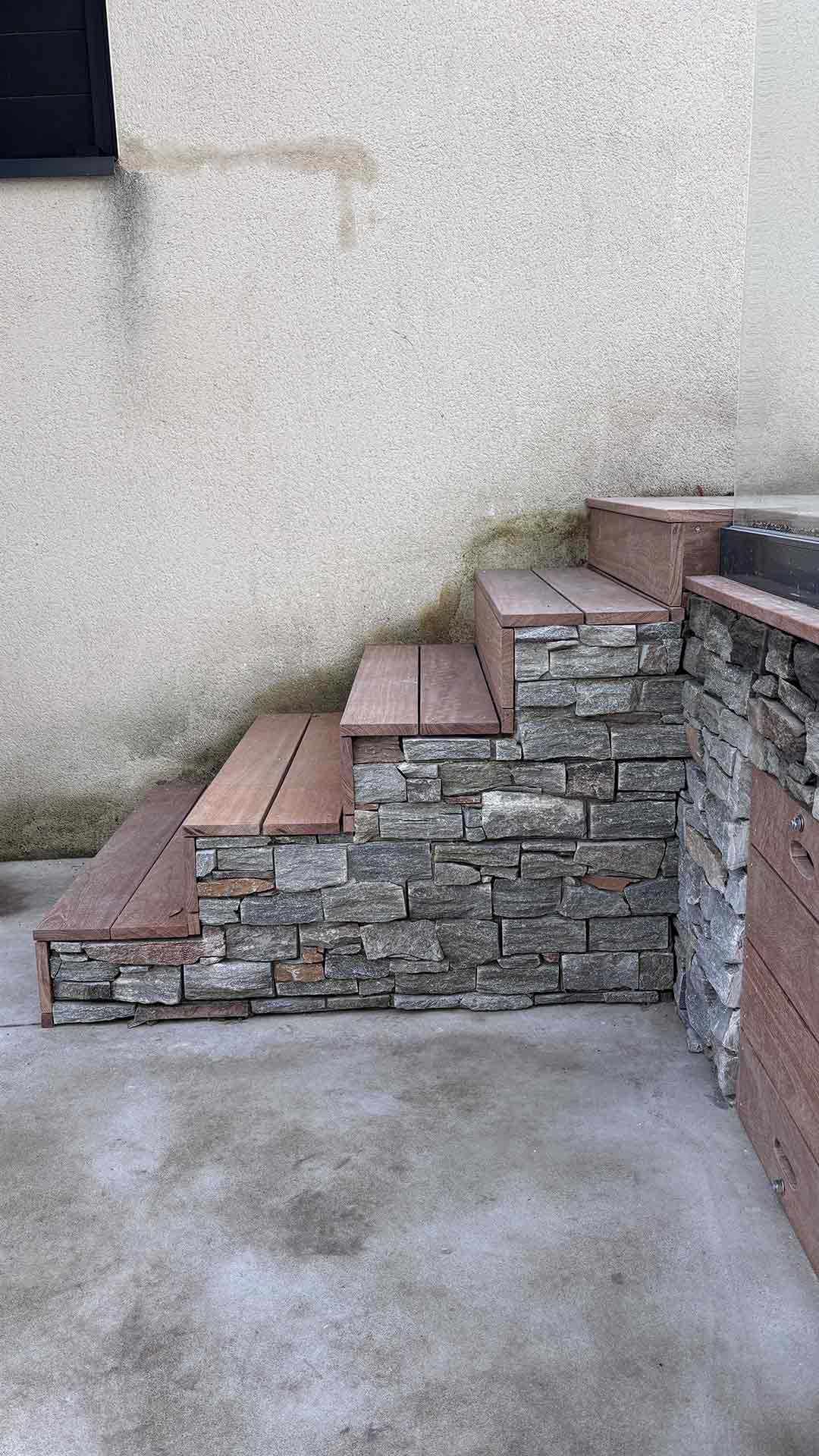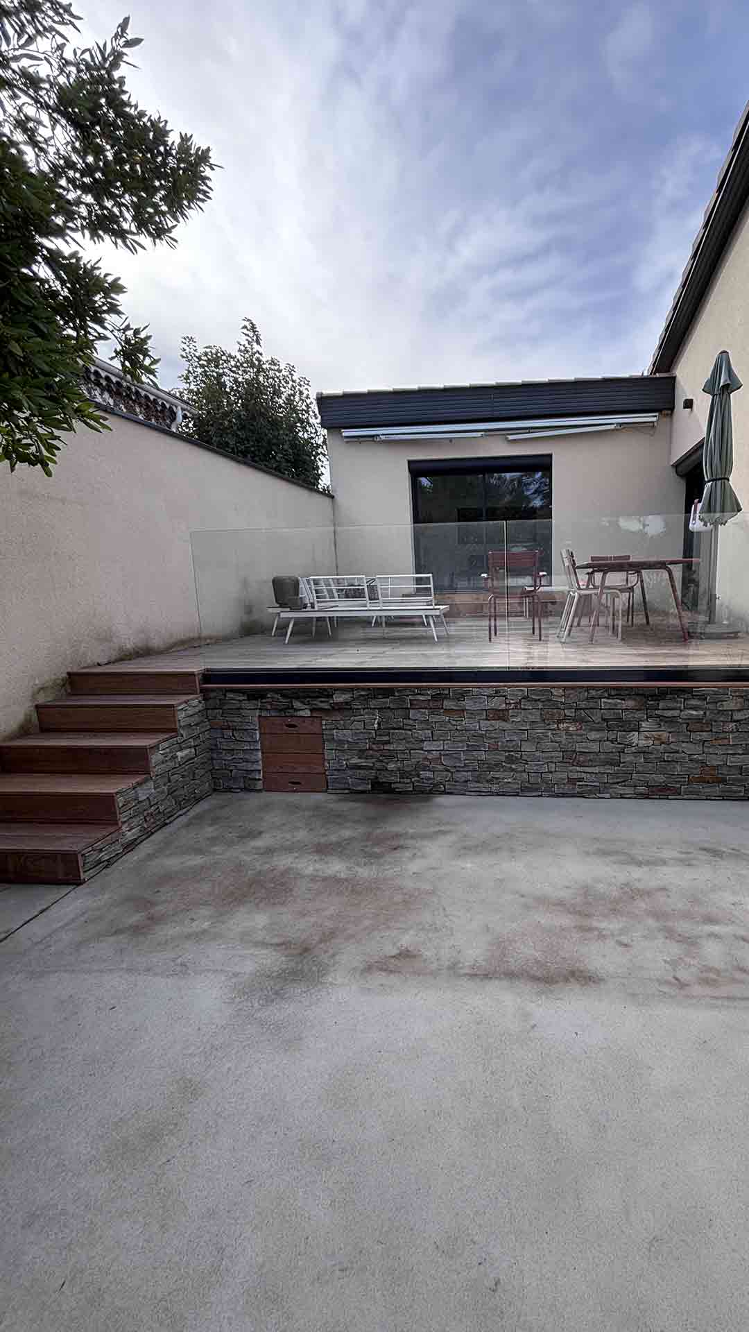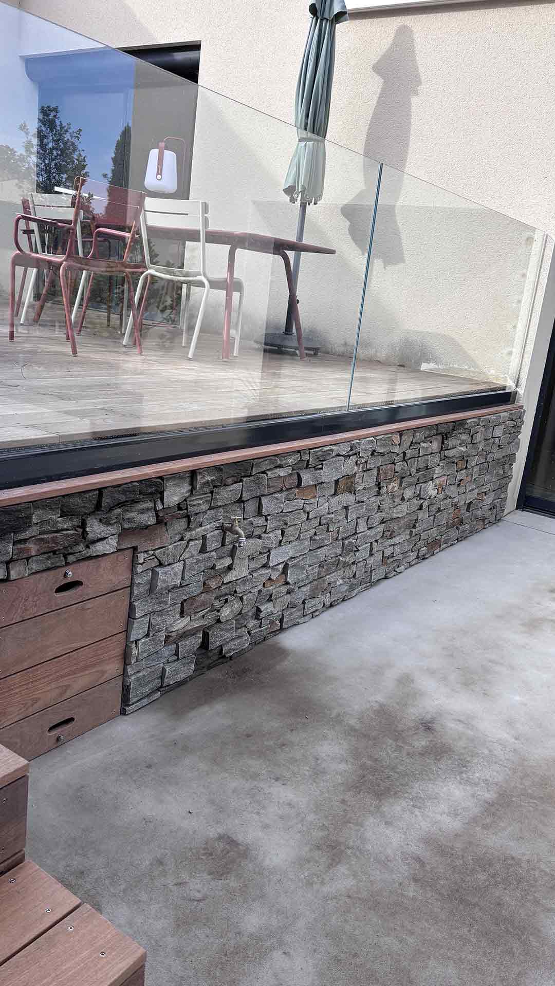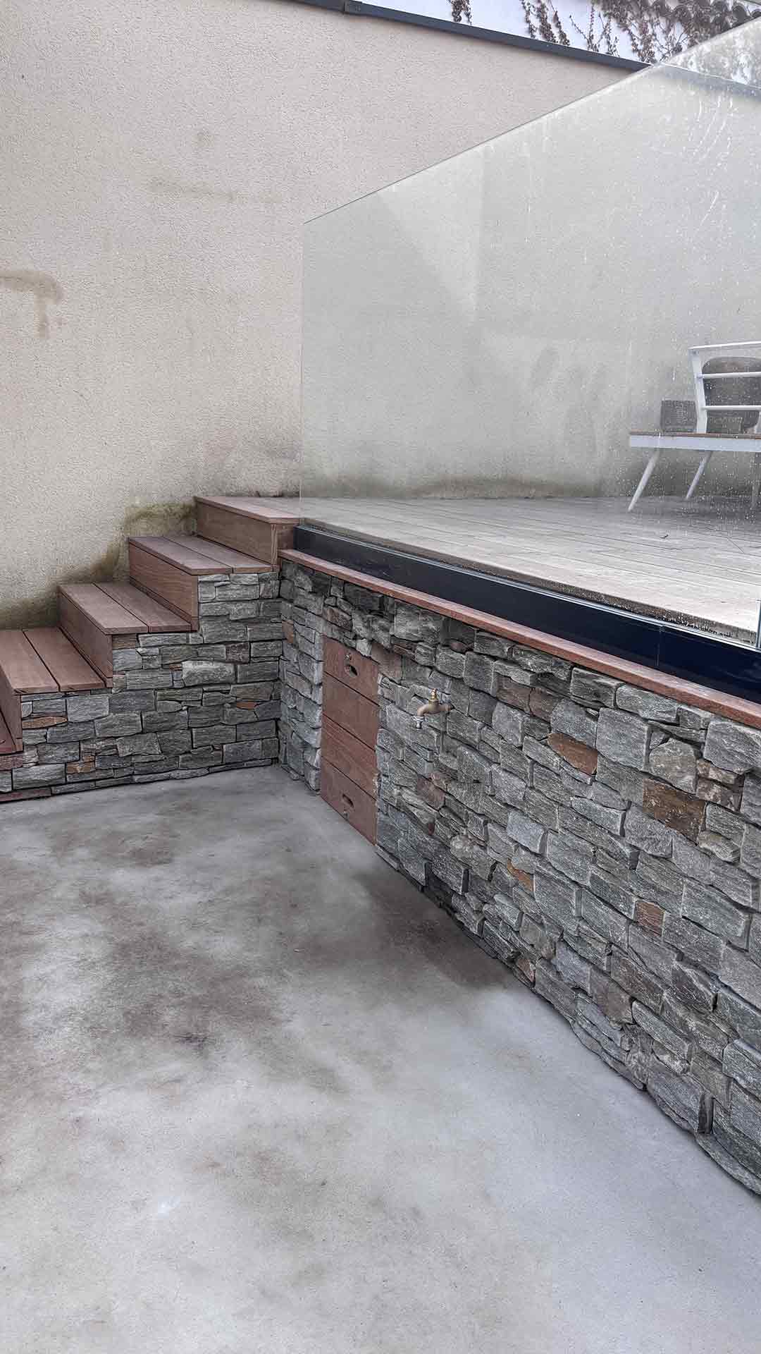 La réalisation débute par la création d’une terrasse en bois, pensée comme un véritable espace de vie. Elle est sublimée par un parement en pierre, apportant du caractère et une touche minérale élégante à l’ensemble.