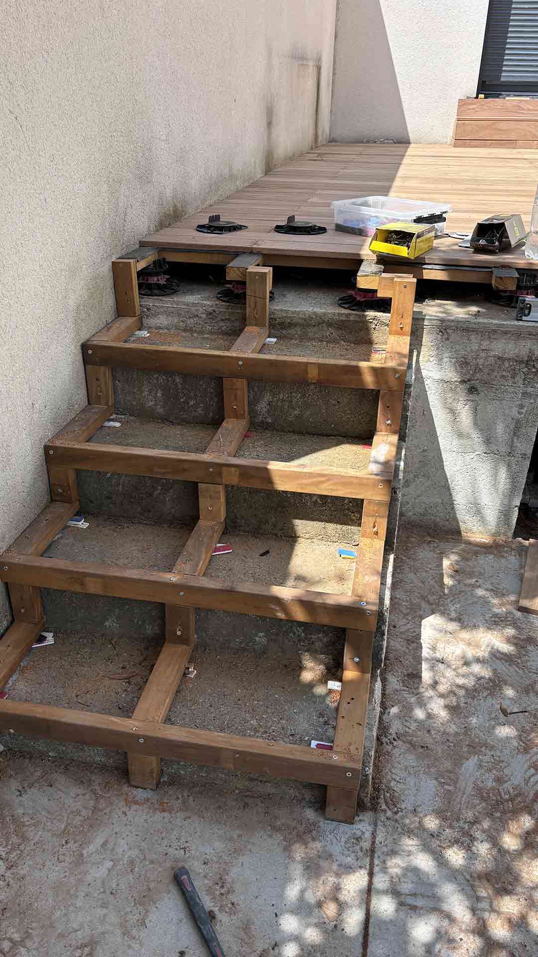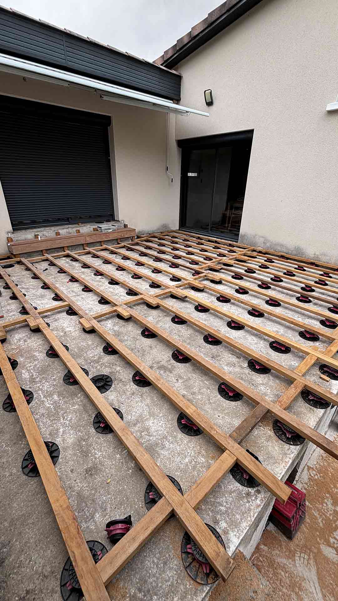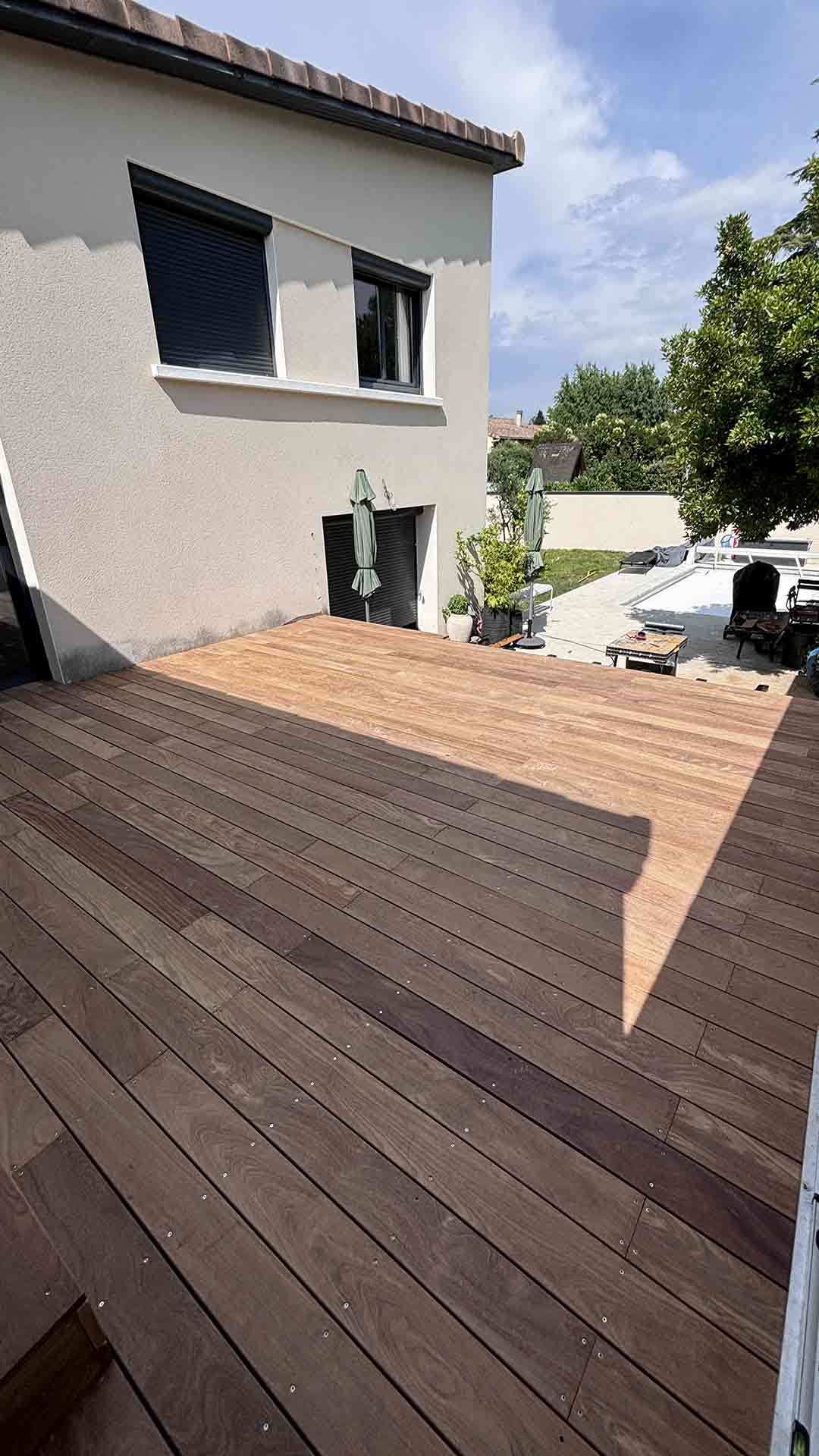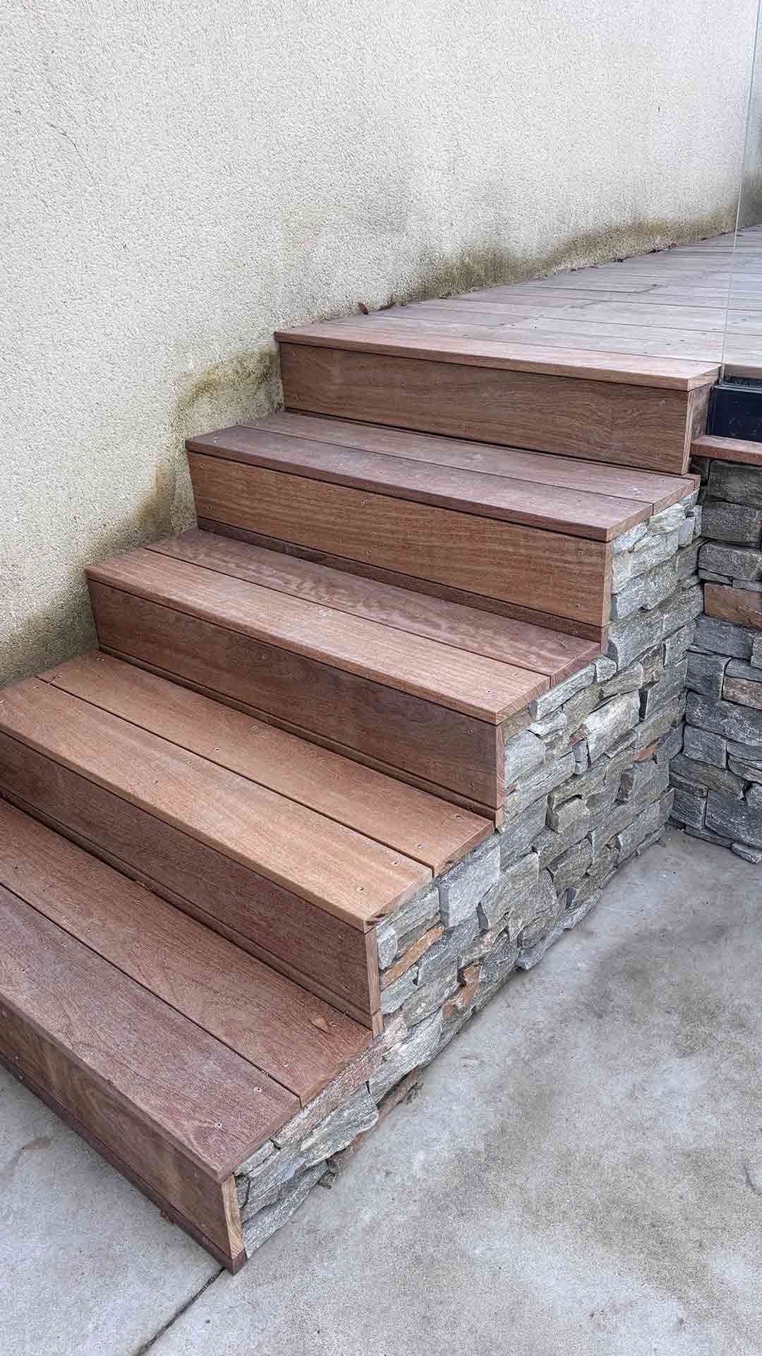 La réalisation débute par la création d’une terrasse en bois, pensée comme un véritable espace de vie. Elle est sublimée par un parement en pierre, apportant du caractère et une touche minérale élégante à l’ensemble.