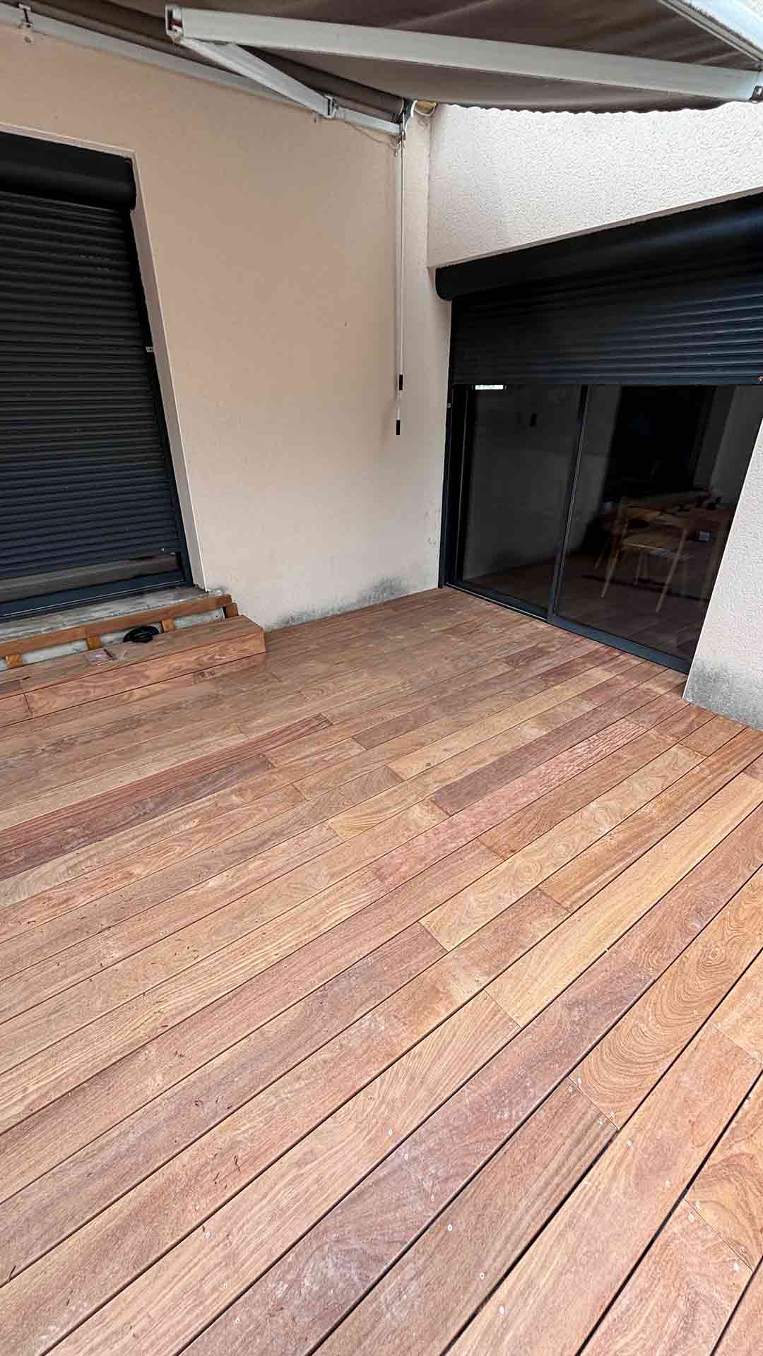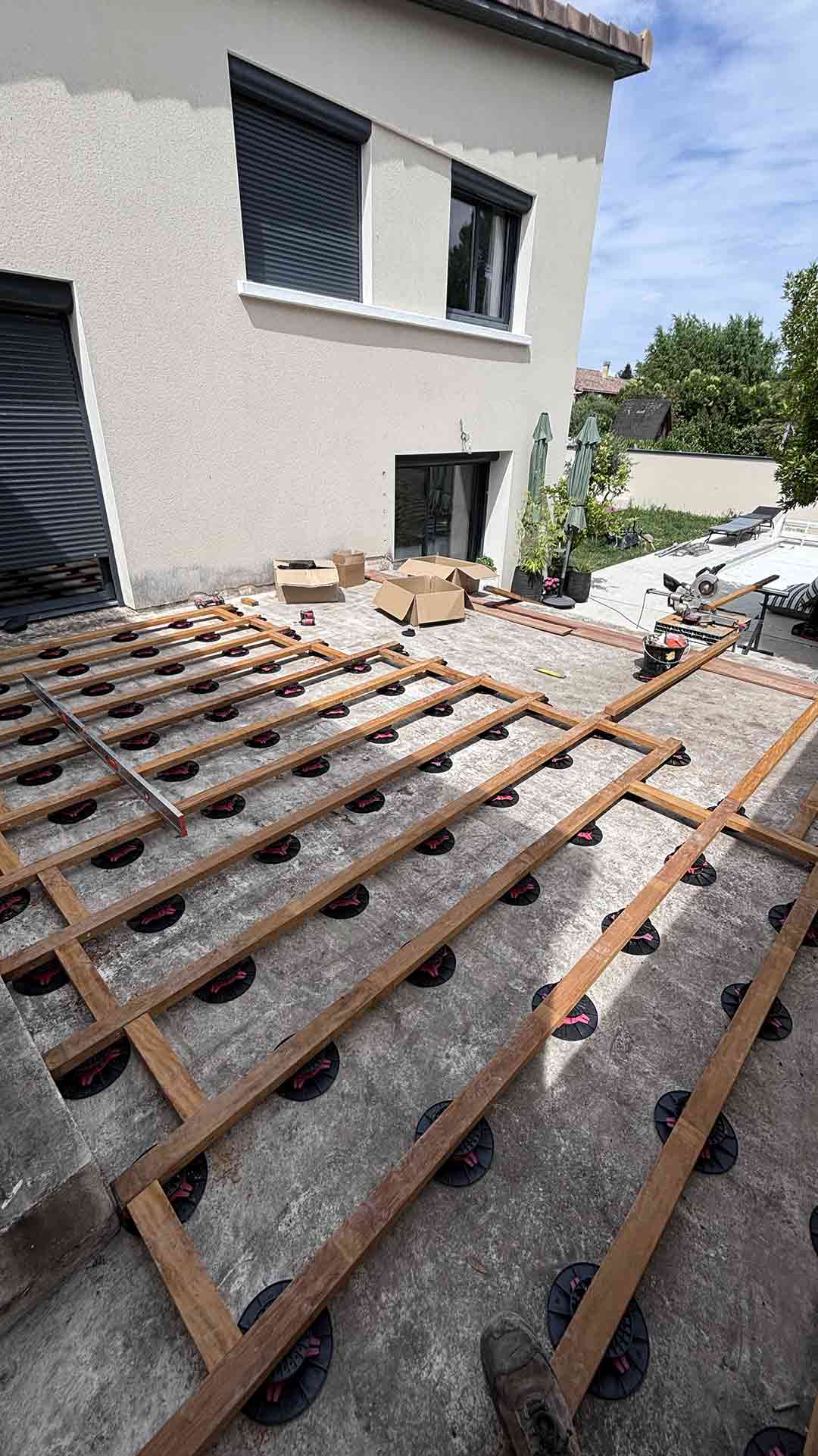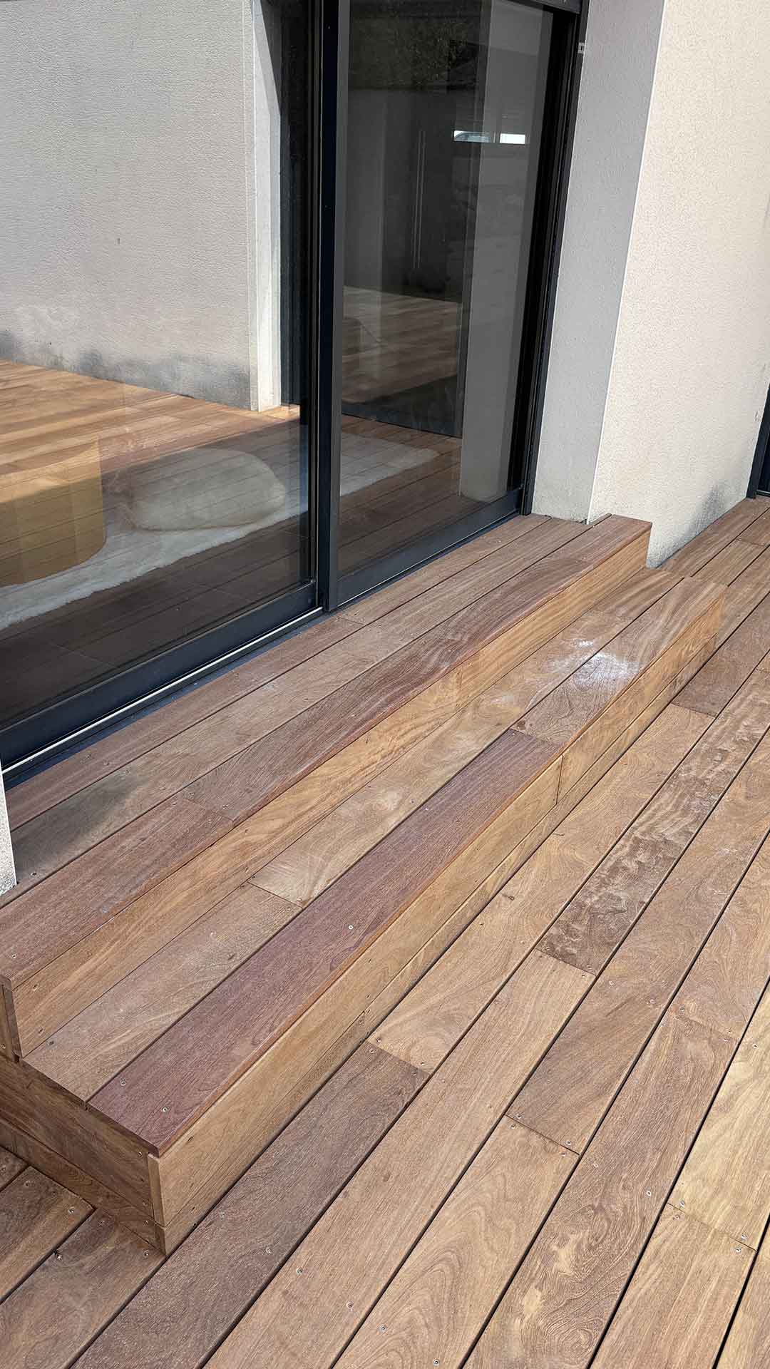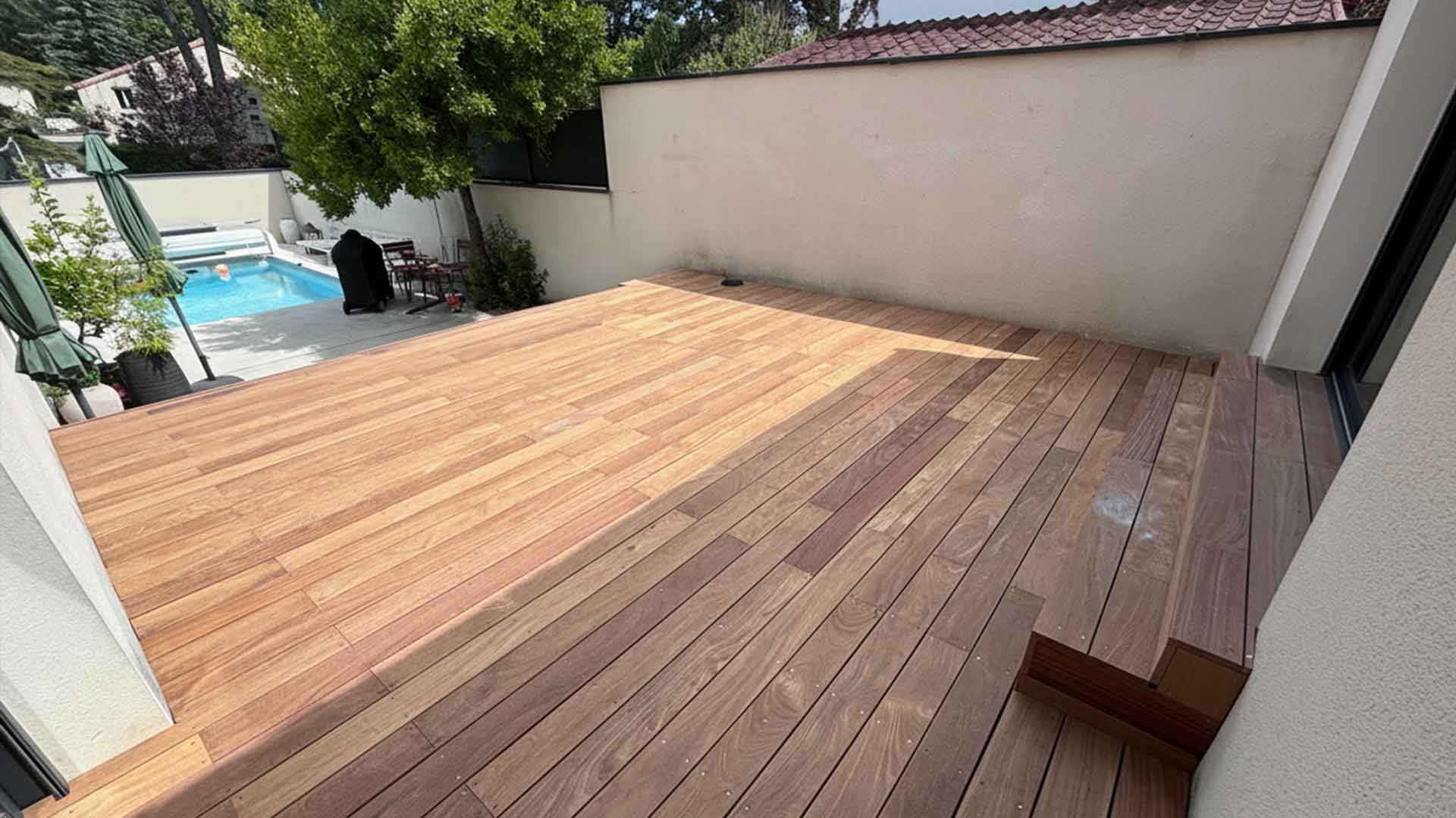 La réalisation débute par la création d’une terrasse en bois, pensée comme un véritable espace de vie. Elle est sublimée par un parement en pierre, apportant du caractère et une touche minérale élégante à l’ensemble.