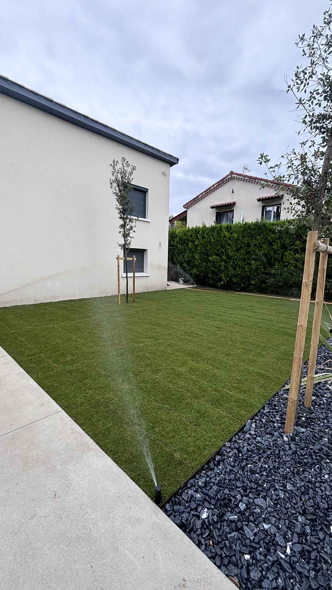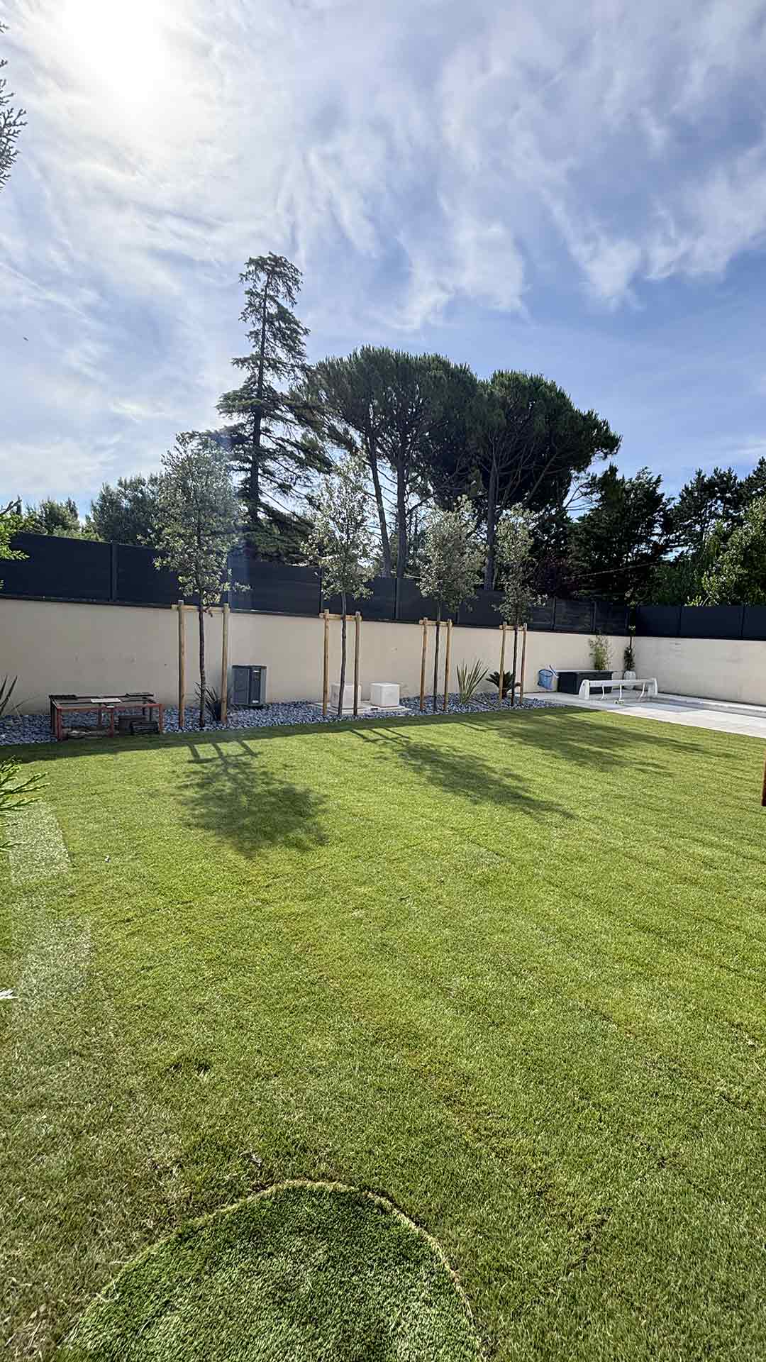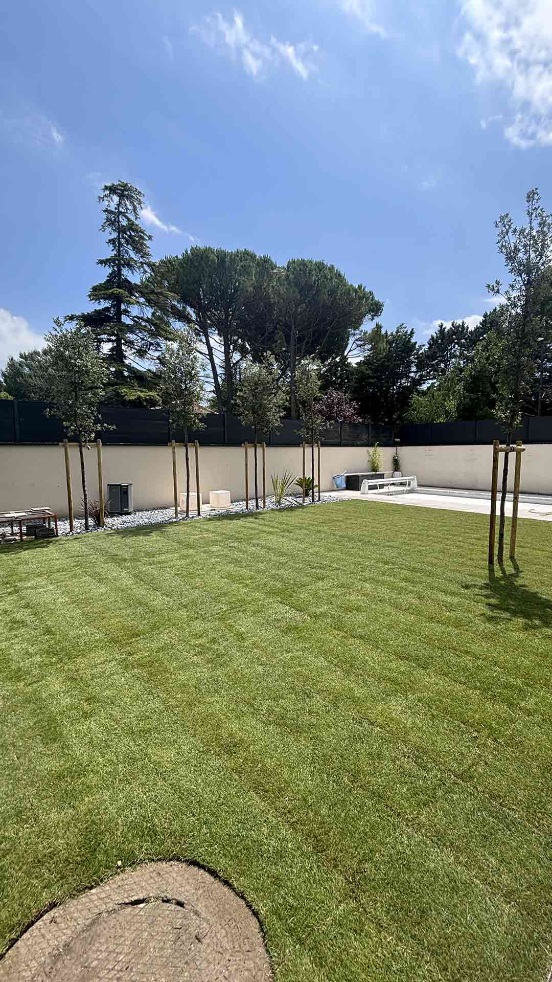 Pour finaliser le jardin, nous avons posé un gazon en plaques, offrant un résultat immédiat, dense et esthétique, accompagné d’un système d’arrosage automatique garantissant une pelouse verte et durable dans le temps