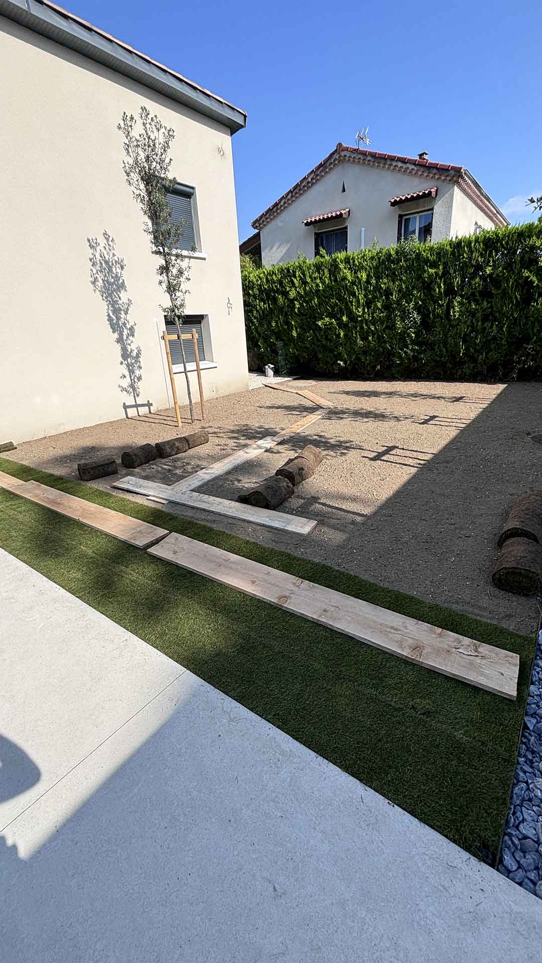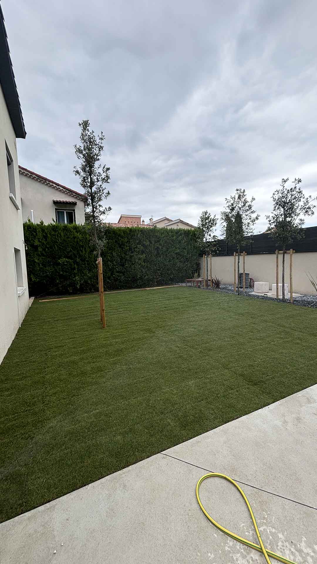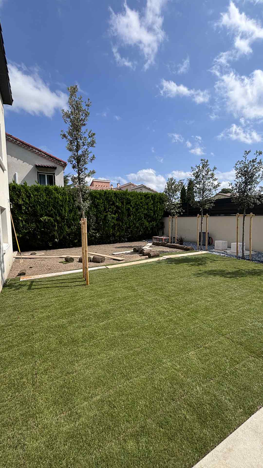 Pour finaliser le jardin, nous avons posé un gazon en plaques, offrant un résultat immédiat, dense et esthétique, accompagné d’un système d’arrosage automatique garantissant une pelouse verte et durable dans le temps