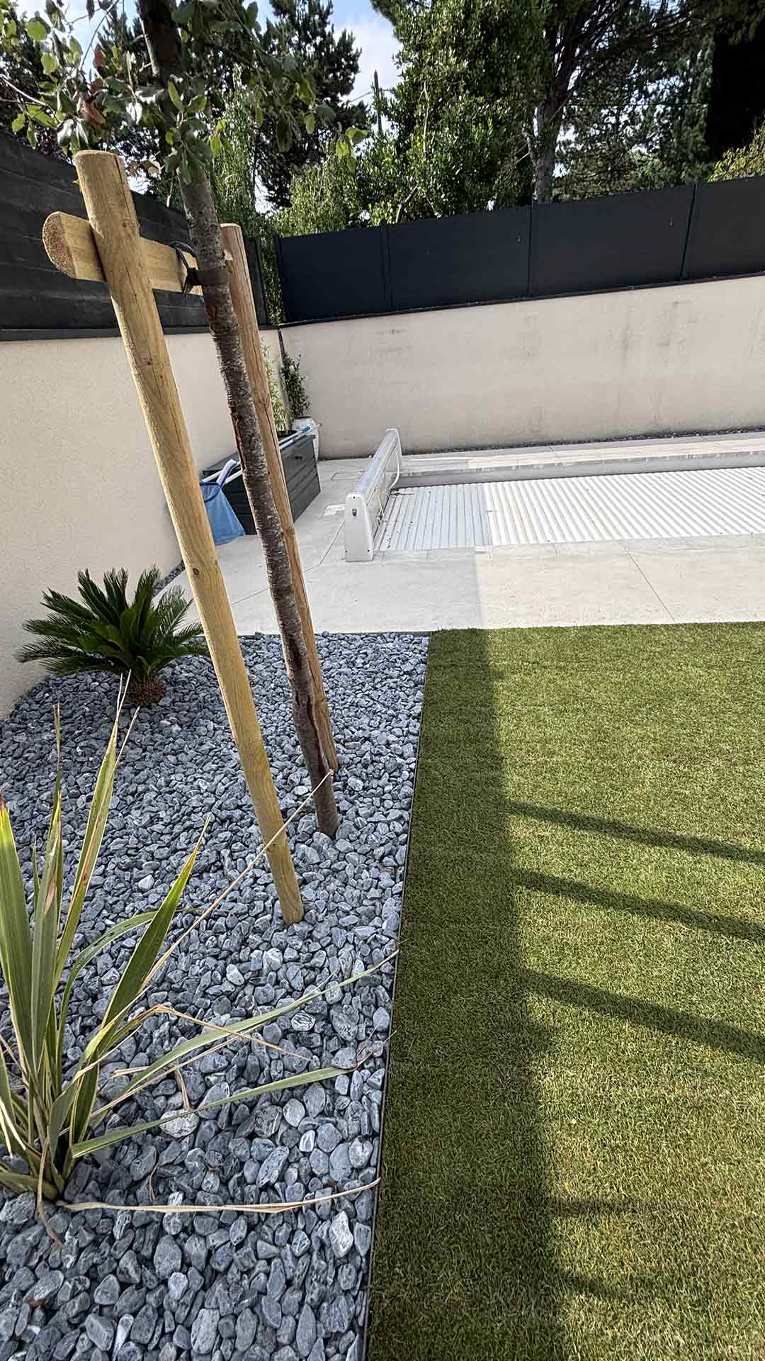 Sur le côté du jardin, des bordures en acier viennent structurer l’espace et accueillir des plantations méditerranéennes, mises en valeur par un gravier gris pour un rendu moderne et soigné. Un tuteurage avec plantation de chêne vert a été réalisé afin d’assurer un développement harmonieux et pérenne de la végétation.